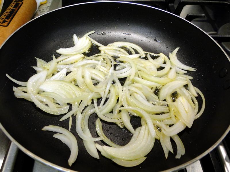 Em uma frigideira grande com azeite frite em lume baixo os alhos e as cebolas, ambos laminados, as folhas de louro e os pimentões cortados em tiras.