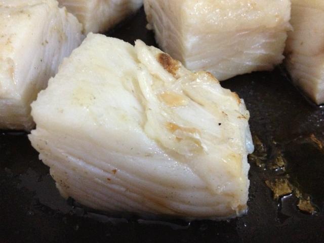Quando a cebola se apresentar dourada, junte o bacalhau para dar uma leve fritada durante, mais ou menos, 5 minutos, envolvendo-o com os ingredientes na frigideira.