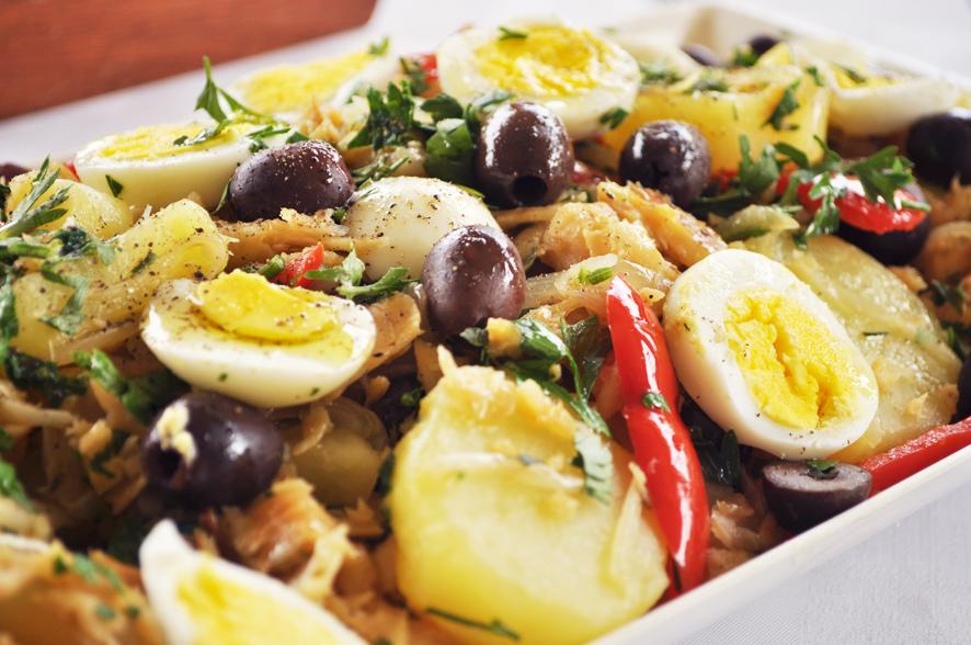 Passado esse tempo coloque o bacalhau ao centro de uma travessa, deite o conteúdo da frigideira sobre ele e, em redor, disponha as batatas, os brócolis, os ovos cozidos cortados em rodelas e as azeitonas. Regue com azeite abundante e acrescente pimenta do reino.