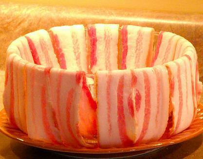 Coloque as tiras de bacon na borda da tigela. As tiras de bacon irão cozinhando e perdendo a água, a parte exterior do bacon vai cair no prato e a parte interna do bacon na tigela, isto fará com que o bacon fique muito saboroso já que eliminou a gordura interna, ficando crocante e saudável.