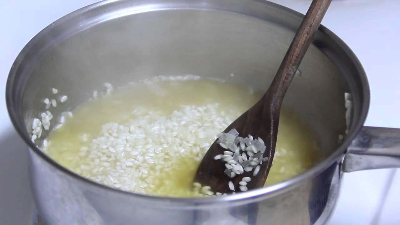 Coloque o feijão em uma panela e leve a fogo médio. Quando esquentar, junte o azeite e a cebola. Tempere com o sal e deixe refogar por dois ou três minutos. Junte o arroz e misture tudo muito bem de forma a envolver os grãos e o azeite por um minuto.