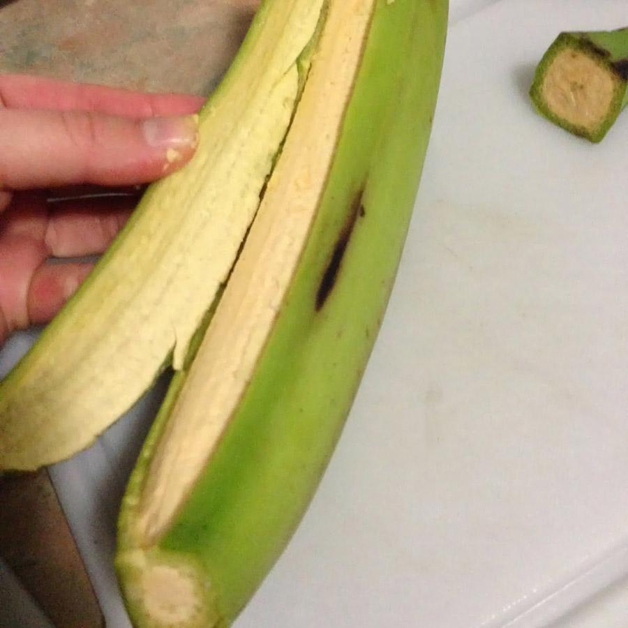 Primeiro descasque as bananas. Para isso, corte as duas pontas e, com uma faca, faça cortes verticais para retirar toda a casca sem problemas. O ideal é que as bananas sejam verdes, mas se tiver só bananas maduras não se preocupe, também pode cozinhá-las.