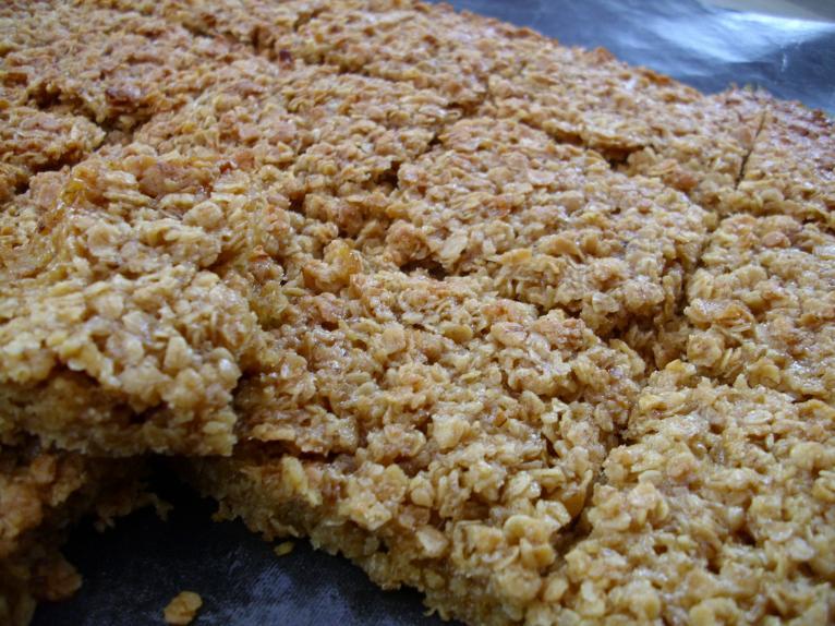 Deixe esfriar um pouco a sua barra de cereal, depois retire-a da forma ainda quente e corte em 12 pedaços.