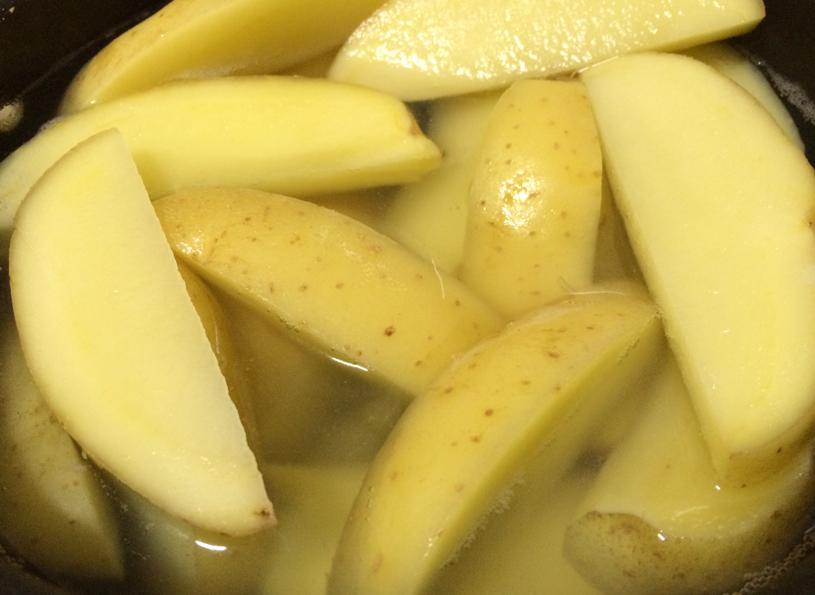 Transfira as batatas para uma panela com água e uma colher de sal e deixe ferver em fogo alto por 5 minutos a partir do momento que levantar fervura. Passado o tempo, escorra bem as batatas para que a assadeira não fique aguada.