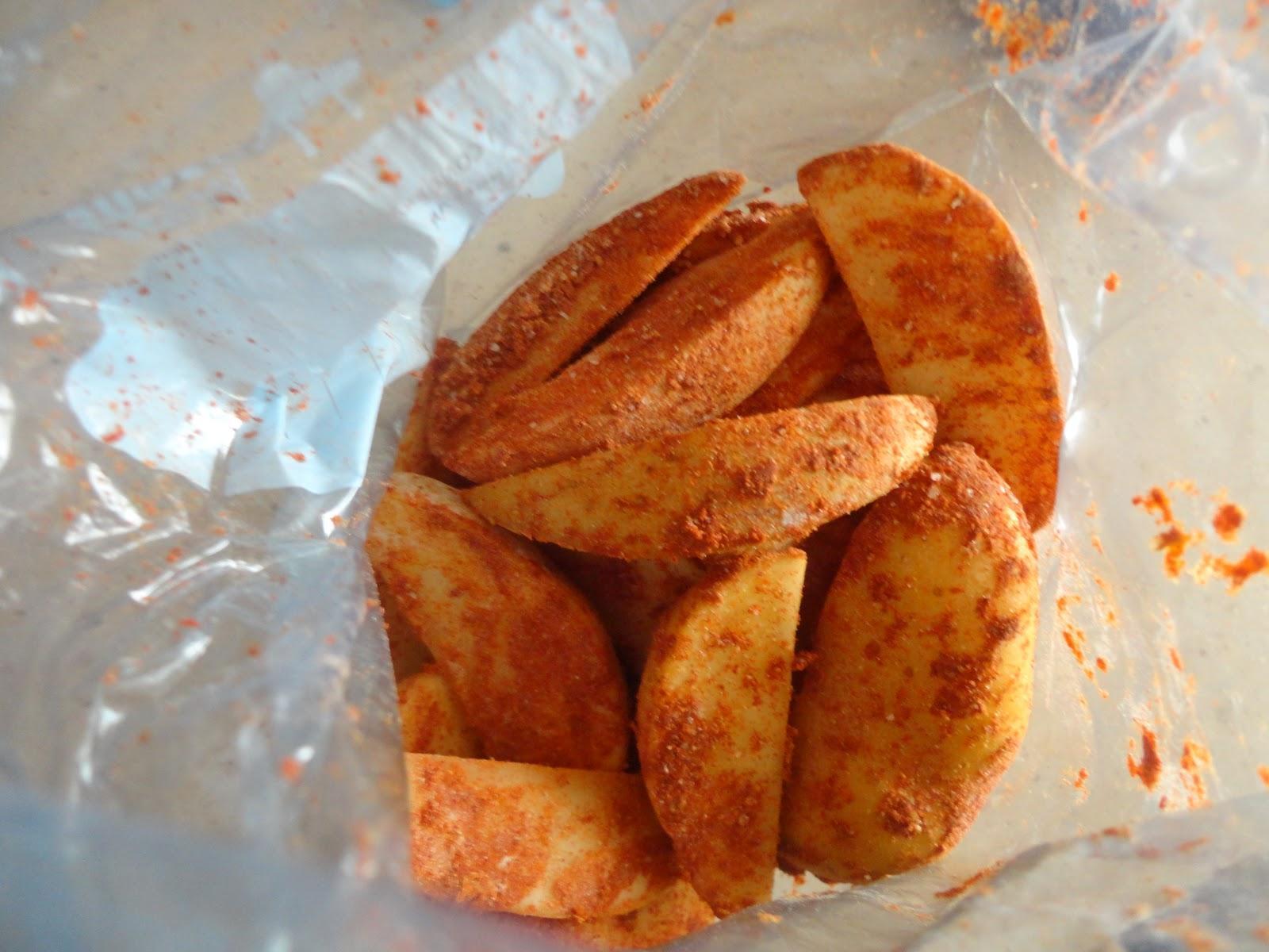 O bom das batatas deluxe está no tempero. Para conseguir que suas batatas fiquem bem empanadas, coloque-as em um saco plástico para congelar e acrescente farinha e sal. Feche o saco com a mão deixando ar dentro e agite para que misture tudo direito.
