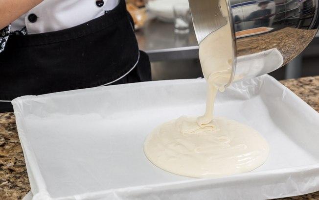 Forre uma assadeira quadrada ou retangular com papel manteiga, de maneira a cobrir o fundo e as laterais. Depois verta a massa do bem casado na assadeira e espalhe-a bem com uma espátula para que fique igualmente dividida na assadeira.