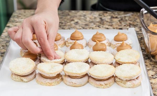 De seguida, deverá cortar os bolinhos bem casados ao meio horizontalmente e colocar um pouco do recheio que você escolheu, uma colher de sobremesa é a medida ideal para o recheio. Depois é só repetir este passo com os retantes bolinhos. Ao fechar as duas partes não deverá pressionar os bolinhos, pois caso contrário o recheio transbordará.