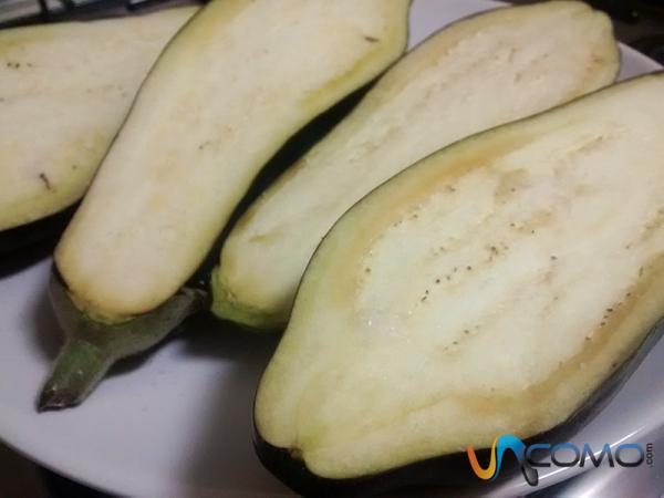 Para começar, corte as berinjelas em duas metades de cima para baixo e com uma faca faça cortes na sua carne, prestando atenção para não romper a pele da berinjela. Coloque as 4 metades na bandeja do forno com o lado da pele para baixo, coloque sal e um pouco de azeite e leve-as ao forno durante 20 minutos.