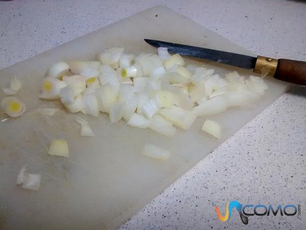 De seguida, pique a cebola bem pequena, adicione sal e refogue-a numa panela, até começar a dourar. Será muito importante manter o fogo na potência mínima para que a cebola se cozinhe mas não se queime.