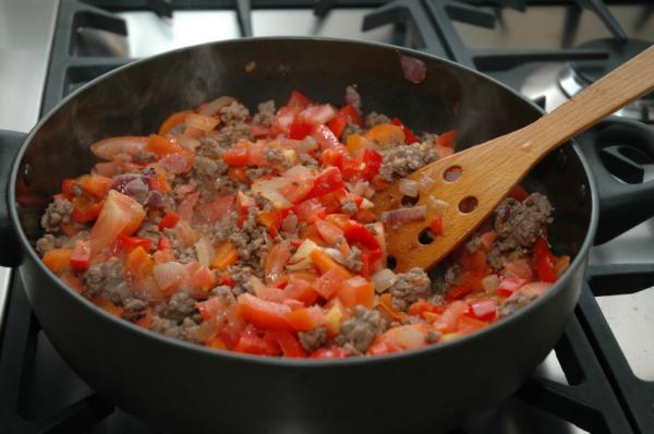Adicione a carne picada (bovina, suína, mista, frango,...) na panela, dê voltas com uma espátula de madeira até ganhar cor. Em outra panela sem azeite (para evitar que as verduras se queimem), doure o bacon e quando estiver pronto, adicione-o à mistura da carne picada e das verduras.