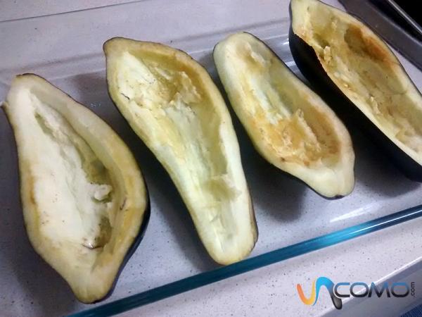 Passado esse tempo, retire as berinjelas do forno e retire a carne com a ajuda de uma faca ou colher. Deve ir com muito cuidado para não romper a pele, uma vez que servirá de recipiente para as berinjelas recheadas.