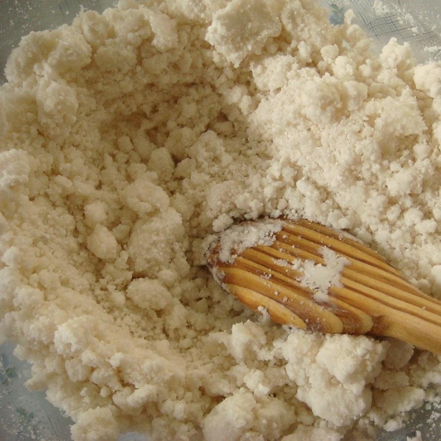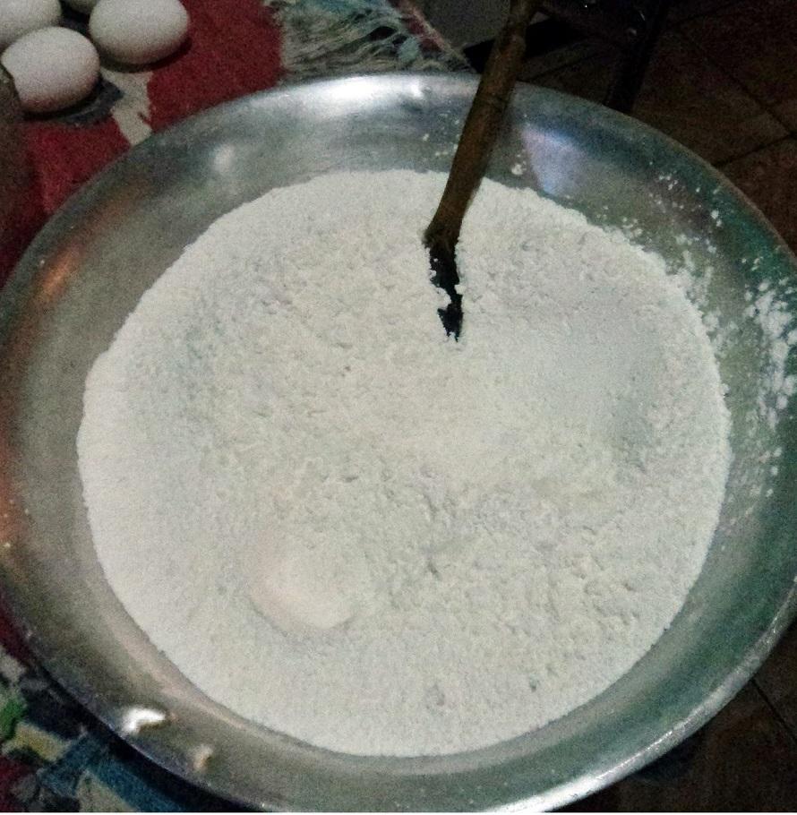 Em um refratário junte o polvilho com sal e, quando os ingredientes anteriores ferverem, coloque metade da quantidade neste refratário.