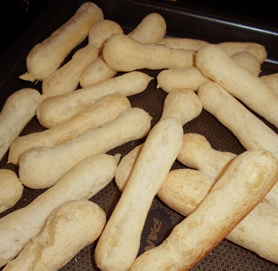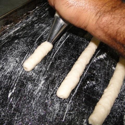 Transfira a mistura para um saco de confeitar e, sobre um tabuleiro ou assadeira untada com manteiga e farinha, crie o formato dos biscoitos, que tanto pode ser em argola, redondo ou palito. Deixe um espaço grande entre eles.