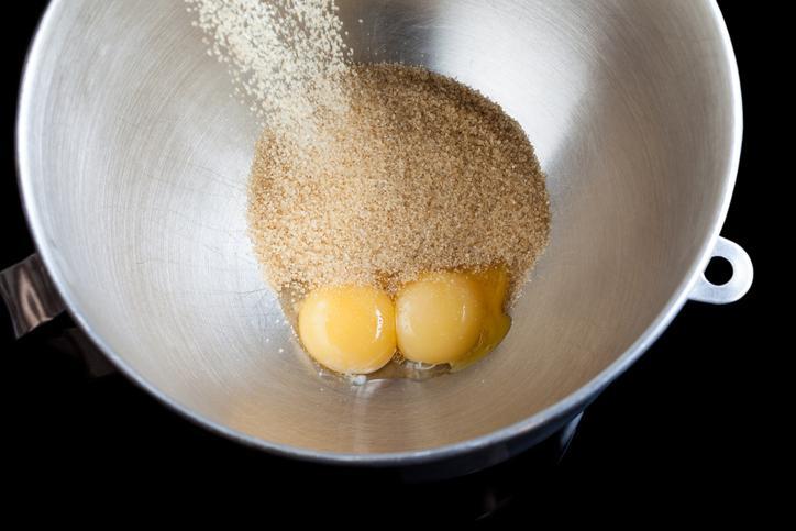 Para começar a preparar esta receita de bolacha integral saudável, pegue um recipiente e despeje nele os ovos, o açúcar-mascavo e o sal. Misture os ingredientes usando um mixer ou fouet, até que o açúcar se dissolva por completo.