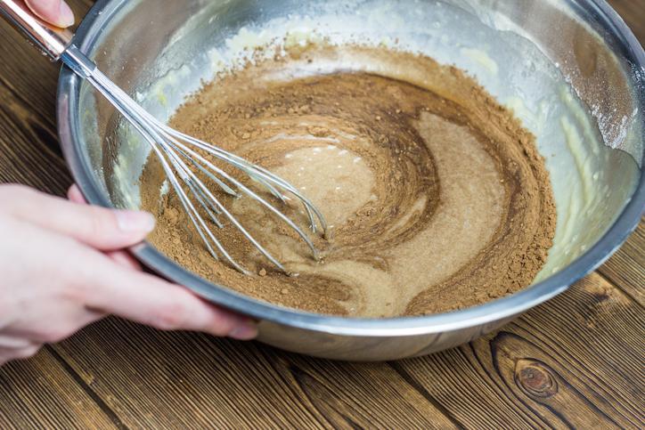 Agora chegou o momento de misturar os ingredientes sólidos. Adicione a farinha de trigo, o fermento e a canela à massa. Misture-os com movimentos suaves e auxílio de uma espátula. Se você não tem uma espátula em casa, pode usar uma colher de pau ou, até mesmo, um garfo. Mexa bem até obter uma massa de textura firme.