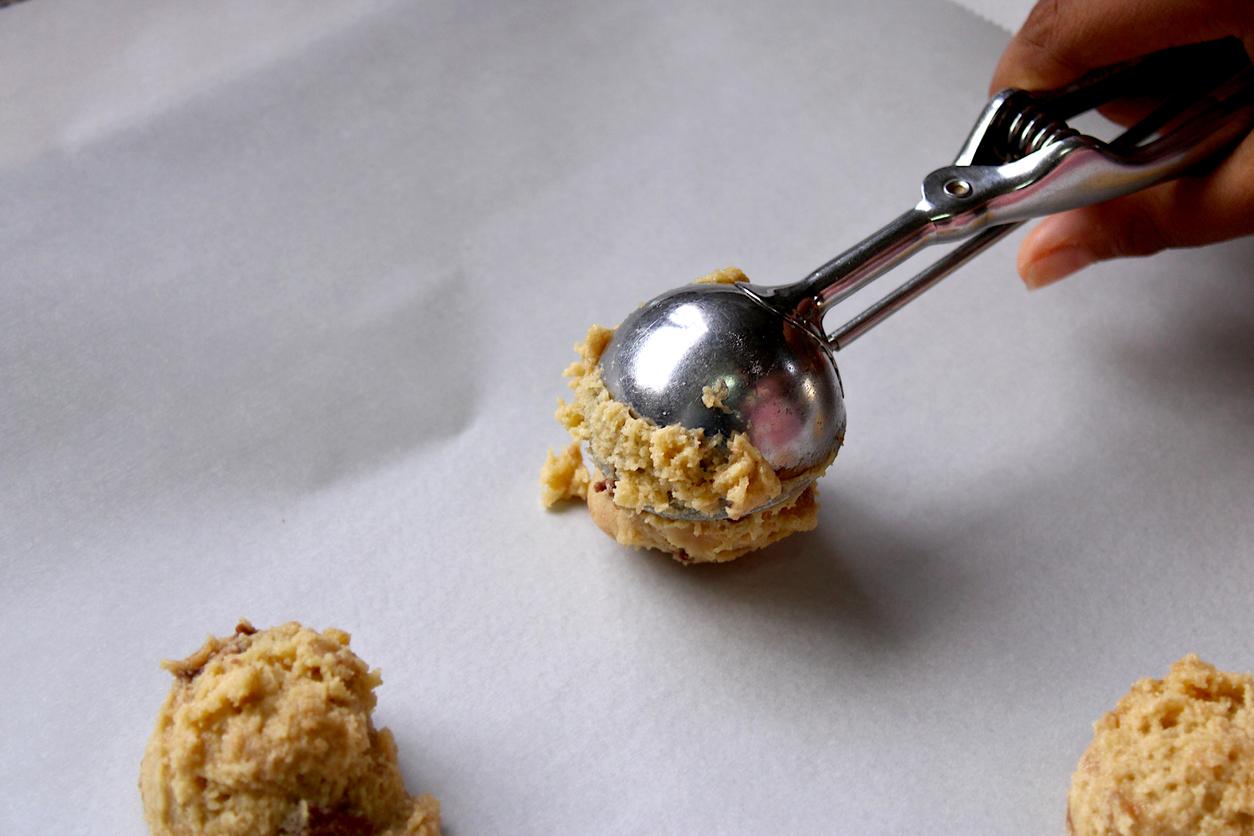 Quando a massa estiver pronta, chega o momento de dar forma às bolachas. Para isso, você deve preparar uma assadeira e forrá-la com papel vegetal. Depois, pegue um pouco de massa com auxílio de uma colher e deposite essa pequena porção na assadeira, repetindo o processo. Certifique-se de que todas as porções para assar tenham o mesmo tamanho.