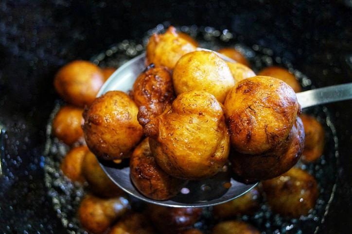 Aqueça uma panela ou frigideira e adicione óleo. Quando o óleo estiver quente, mas não soltando fumaça, adicione os bolinhos de mandioca, sempre em pequenas porções para que o óleo não esfrie. Deposite entre 4 e 6 unidades por vez.
