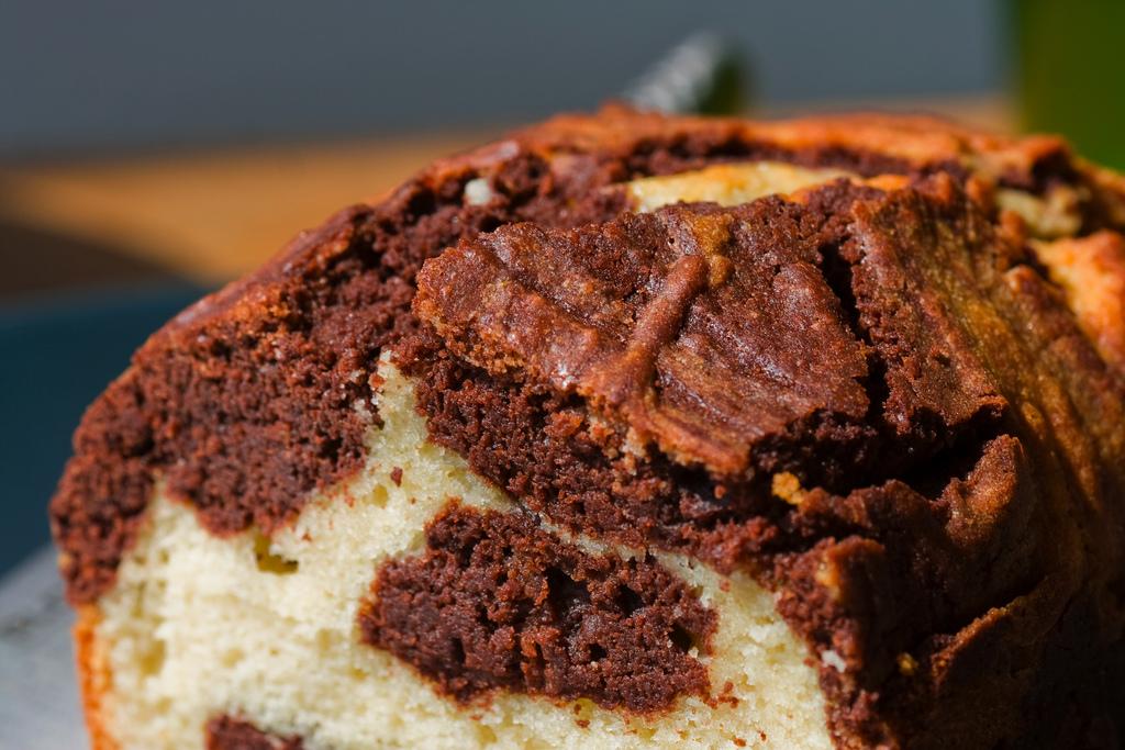 Pré-aqueça o forno a 180 graus Celsius. Enquanto isso amasse bem a massa para ficar homogênea e sem grumos. Prepare uma fôrma para o bolo e unte bem com a manteiga que restou. Coloque um terço da massa na fôrma, e utilize uma colher para alisar. Num recipiente à parte coloque outro terço da massa e junte o cacau em pó. Misture bem o cacau. Coloque essa massa com cacau na forma e com um garfo misture suavemente. Termine colocando o restante de massa, último terço, na fôrma e leve ao forno.