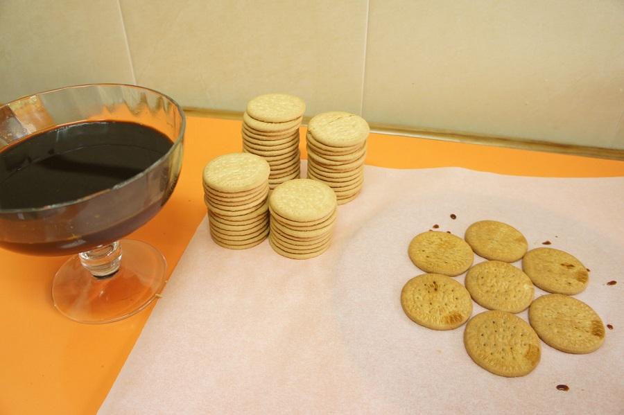 Faça uma xícara de café forte e morno e verta-o para um prato. Passe as bolachas, uma a uma, pelo café e coloque-as na taça ou prato onde irá servir o bolo, dando-lhe a forma que pretender, por exemplo de flor, criando a primeira camada do seu bolo.