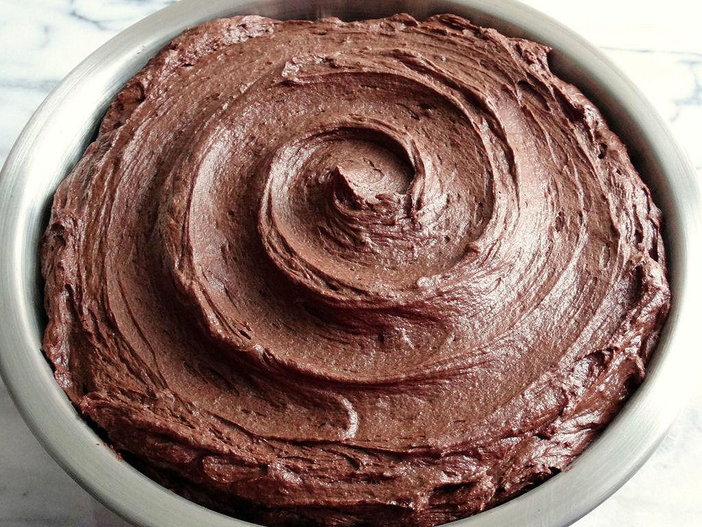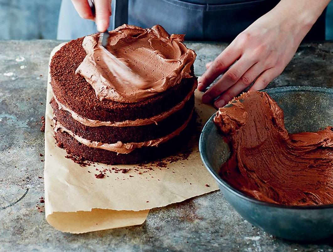 Espalhe o do recheio por todo o bolo, até que fique completamente coberto. Deixe um pouco de recheio de parte para decorar o topo com o bico. Coloque as avelãs trituradas na palma da mão e pressione nas laterais do bolo até cobrir a totalidade da superfície.