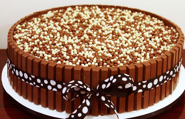 Quando terminar de grudar todos os Kit Kats pela lateral, delicadamente amarre-os ao bolo com uma fita e finalize com um lindo laço.