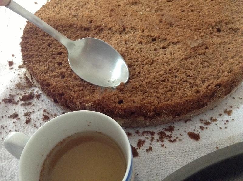 Com o auxílio de uma espátula ou faca de pão, passe o brigadeiro (que deve estar frio) sobre a parte dividida do bolo. Coloque então as duas partes uma sobre a outra novamente.