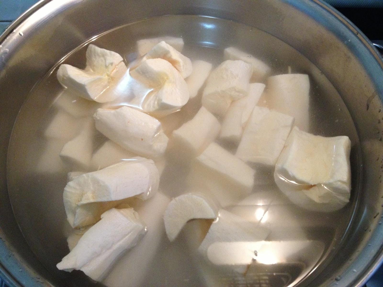 Para fazer essa receita de bolo de mandioca, comece por cozinhar as mandiocas. Para isso, deverá adicionar água em uma panela, colocar as mandiocas e cozinhar até ficarem bem macias. Depois escorra e retire a parte dura do centro.
