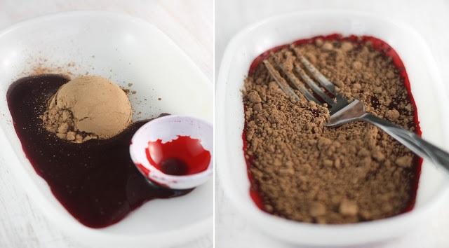 Em uma tigela pequena misture o corante alimentar vermelho, o cacau e a essência de baunilha. Reserve.