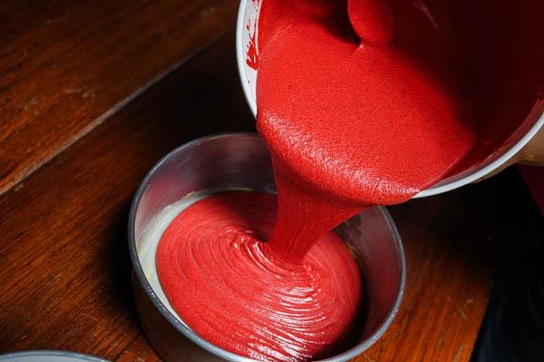 Bata tudo muito bem e adicione o sal e a mistura inicial do corante, cacau e essência de baunilha. Por último, misture o bicarbonato de sódio e vinagre branco e adicione à massa do bolo red velvet.