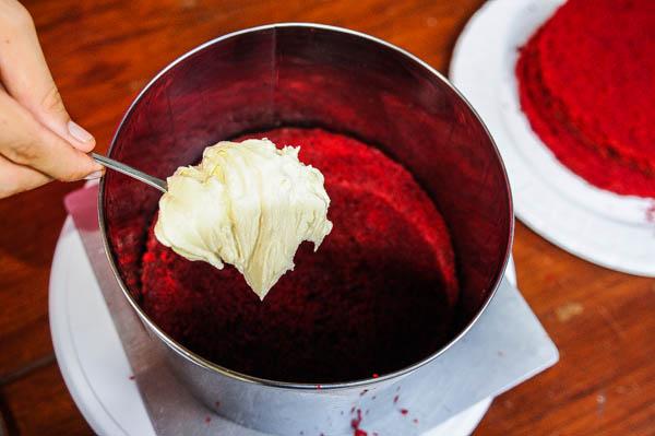 Com o recheio e bolo prontos é hora de começar a montar o nosso red velvet. Corte o bolo em duas, três ou mais partes e coloque entre cada parte do bolo o recheio.