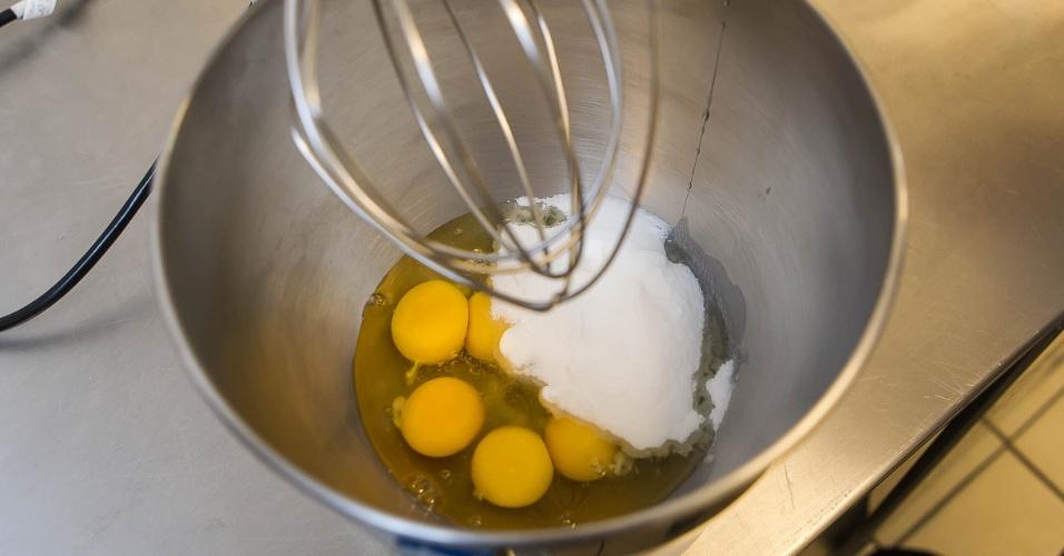 Para fazer bolo zebra, comece por misturar em uma tigela o açúcar com os ovos. Bata com a batedeira elétrica até obter uma mistura cremosa e clara.