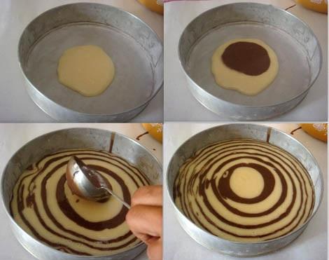 Em uma forma redonda untada e enfarinhada vamos começar a colocar a massa para conseguir o efeito zebra. Para isso, comece por colocar no centro da forma 1 colher cheia de massa branca. No centro e por cima dessa massa branca, adicione agora 1 colher cheia da massa de chocolate. Continue repetindo a operação até que as duas massas acabem, com isso vai garantir o visual do bolo zebra. Não se preocupe que a massa vai se ajeitando à medida que for adicionando, cobrindo assim o fundo da forma.
