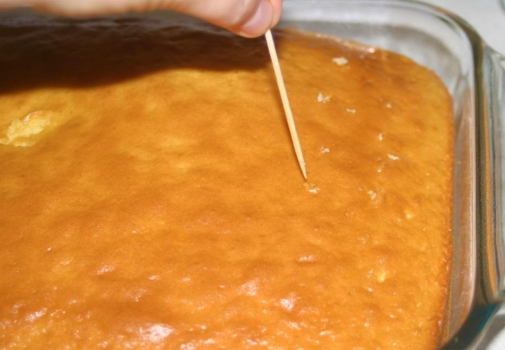 Dica: Para se certificar que está pronto, coloque um palito no centro do bolo. Se sair limpo, pode retirar do forno.