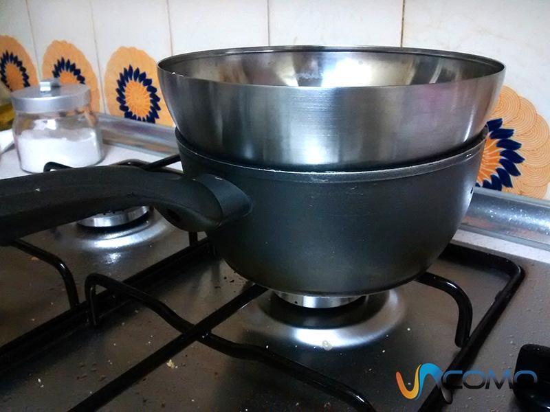 A seguir, coloque no fogo uma panela com água e uma tigela -ou outra panela menor- em cima para preparar o banho-maria, a técnica por meio da qual derreteremos o chocolate para os bombons. É importante que a água não chegue a tocar o fundo da tigela, pelo qual não será necessária muita quantidade.