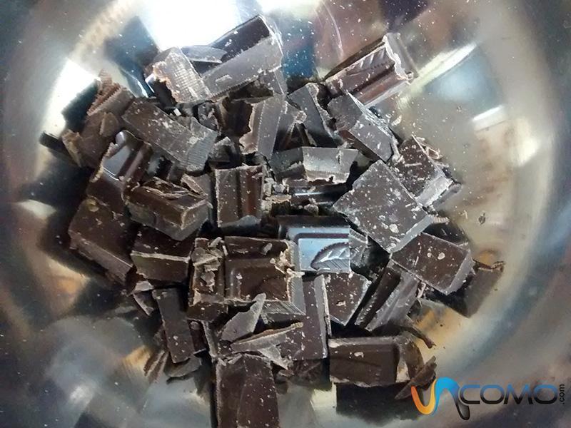 Mexa o chocolate para juntar os pedacinhos que acaba de adicionar e para que não fiquem grumos, você deverá ter cuidado para não se queimar, já que o recipiente estará quente.