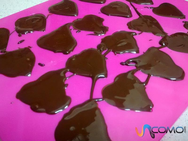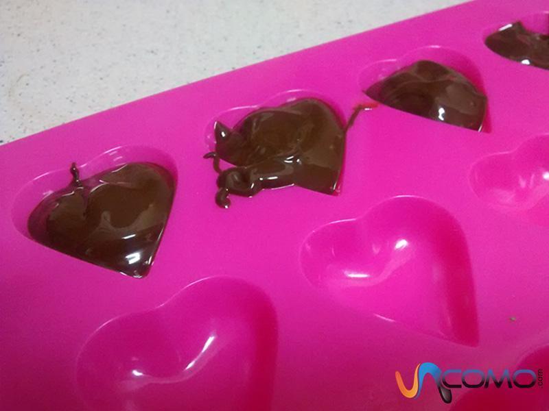 Com a ajuda de duas colherinhas, vá preenchendo com o chocolate derretido o molde com formas de coração. Será importante não demorar demais, porque, caso contrário, o chocolate derretido irá endurecendo.