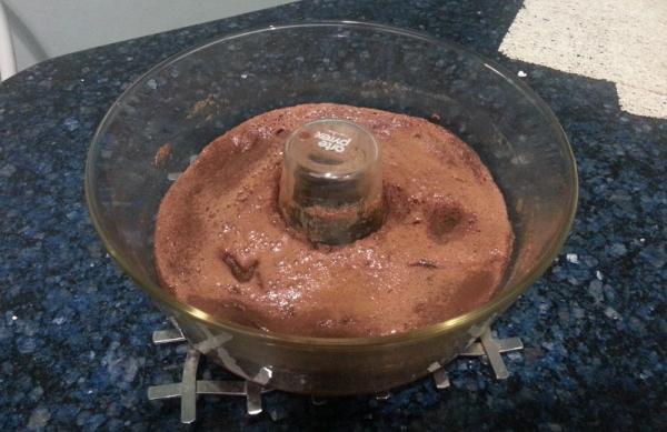 Quem optou por assar no microondas deve levar o refratário de vidro ao microondas em potência alta por 10 minutos ou até quando ele começar a crescer e ficar mais firme.