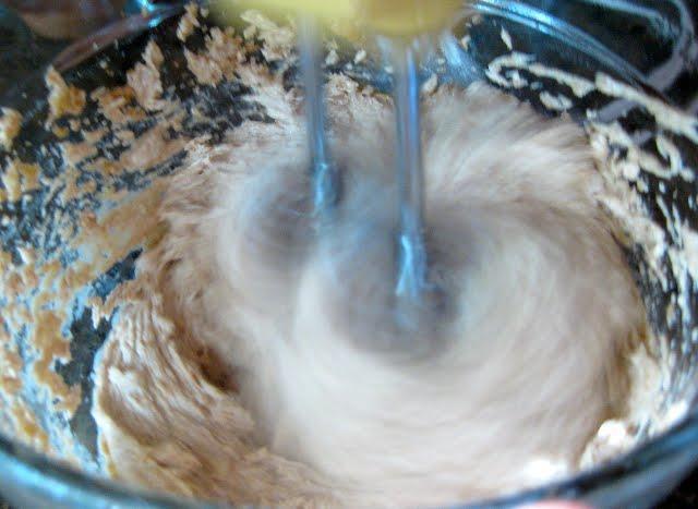 Em uma tigela grande, bata a manteiga, o açúcar mascavo, os ovos e a baunilha até que fique uma mistura suave. Adicione a mistura de farinha na mistura de ovo e bata até que estejam bem misturados.