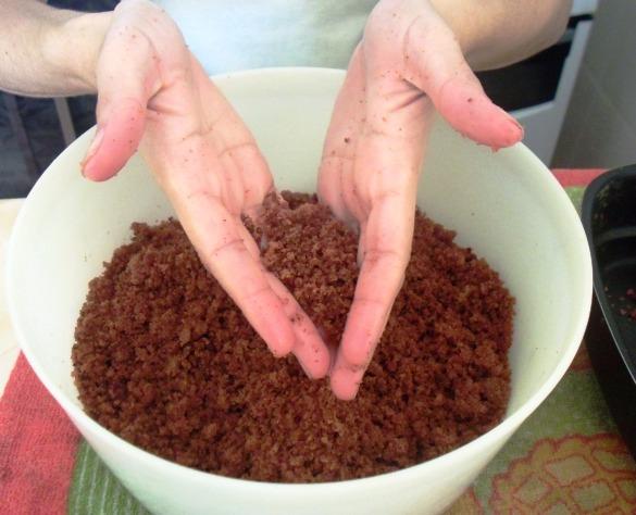 O primeiro passo para fazer cake pop colorido é esfarelar os bolos, esfarele o bolo de chocolate para um recipiente e o bolo red velvet para outro recipiente. Caso não tenha como fazer o bolo red velvet pode substituir por um bolo simples, não existe problema, o importante é haver mais que um sabor de bolo para impressionar o povo lá de casa.
