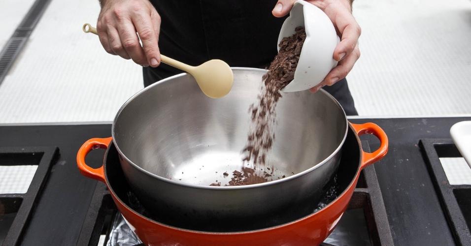 Enquanto os cakes pops estão na geladeira, prepara-se o chocolate, para isso basta derretê-lo em banho maria, coloque os dois chocolates em panelas separadas. Se quiser dar um pouco de cor ao seu cake pop pode colocar no chocolate branco uns pingos de corante rosa ou outra cor que você pense que seja mais adequada à sua festa.