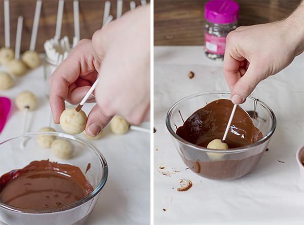 Com ambos os chocolates derretidos retire os cakes pops da geladeira, pegue nos palitos e mergulhe a ponta no chocolate, alternado entre o chocolate branco e o chocolate de leite e espete nos cakes pops. Deixe escorrer um pouco os cake pop e coloque confeitos coloridos ainda com a cobertura mole.