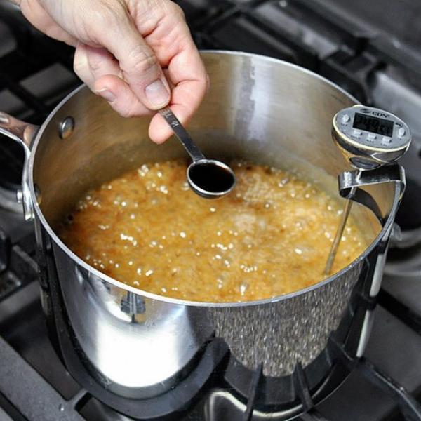 Quando se transforma em caramelo, a calda tradicional ganha um tom dourado. Pode juntar a xícara de água e continuar mexendo com uma colher de pau. Deixe ferver até os torrões de açúcar estarem bem dissolvidos.