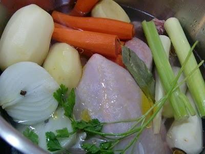 Quando a água tiver fervido, acrescente o resto das verduras. Durante os primeiros minutos de cozimento os ossos do frango e o resto dos ingredientes irão soltando espuma, por isso é imprescindível pegar uma espumadeira e retirar aos poucos esta espuma para obter um caldo claro.