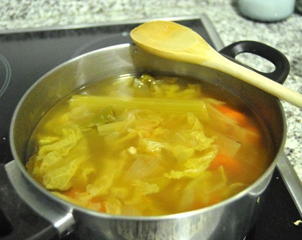 Quando começar a ferver, baixe o fogo e deixe cozinhar durante 20 minutos. Passado esse tempo, apague o fogo e coe o caldo de verduras.