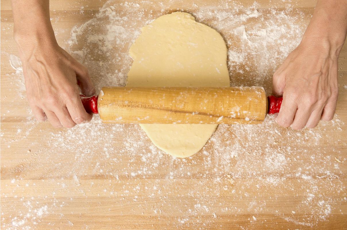 Abra a massa com um rolo (ou usando as duas mãos) numa superfície enfarinhada para evitar que cole, ou estique a massa no meio de dois filmes plásticos. Corte a massa em pequenos círculos.