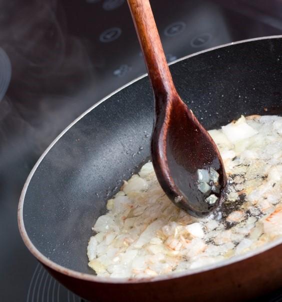 A seguir, deverá colocar azeite de oliva em uma frigideira -não poupe com a quantidade, mas também não inunde a frigideira- e coloque no fogo para esquentar. Assim que notar que esquentou o suficiente e sem que o azeite chegue a fumegar, poderá baixar o fogo para o mínimo e jogar a cebola cortada.