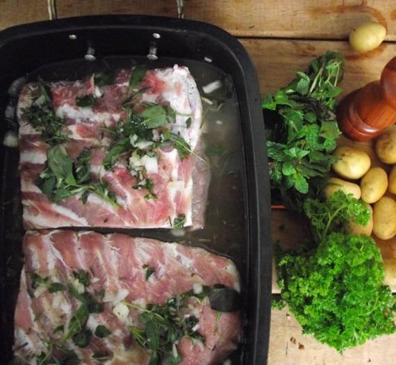 Corte a costelinha em tirinhas e coloque-a em um refratário com todos os ingredientes à excepção do óleo.