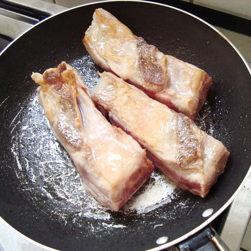 Escorra as costelinhas e coloque-as na frigideira para fritar.
