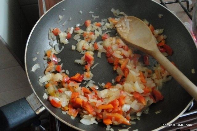 Quando as couves de bruxelas estiverem cozidas ligue o forno para pré-aquecer a 200ºC. Depois comece a fazer o molho para gratinar este delicioso prato. Lave o pimentão e a cebola e descasque este último ingrediente, depois pique em juliana.