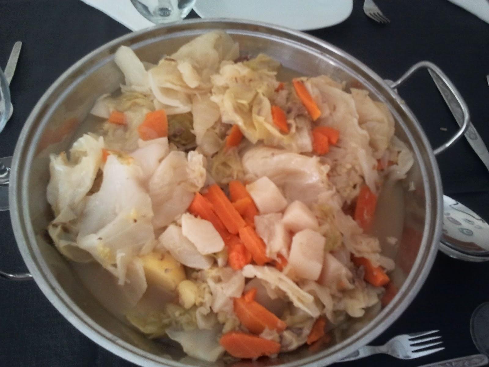 Na mesma água onde cozeu as carnes, introduza a cenoura e a couve, deixando ferver por cerca de 5 minutos. Adicione a batata e o nabo.